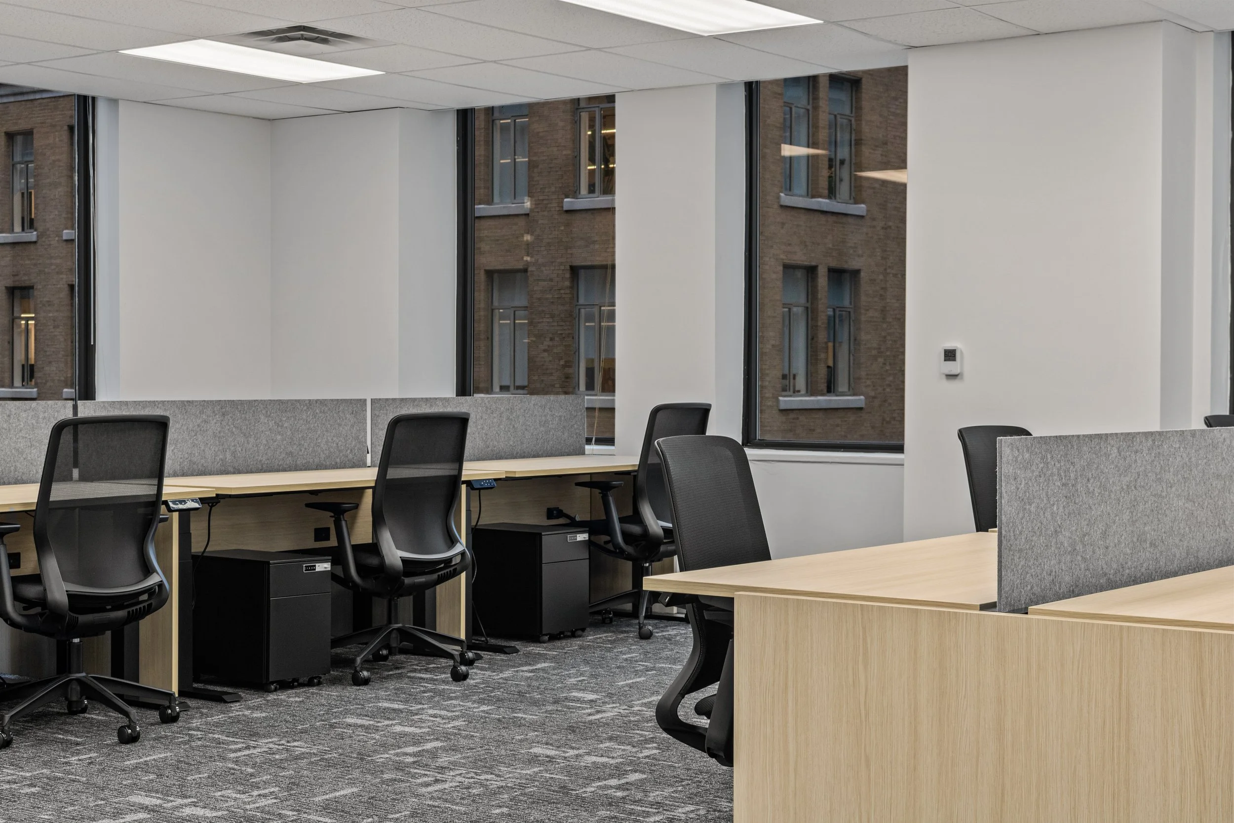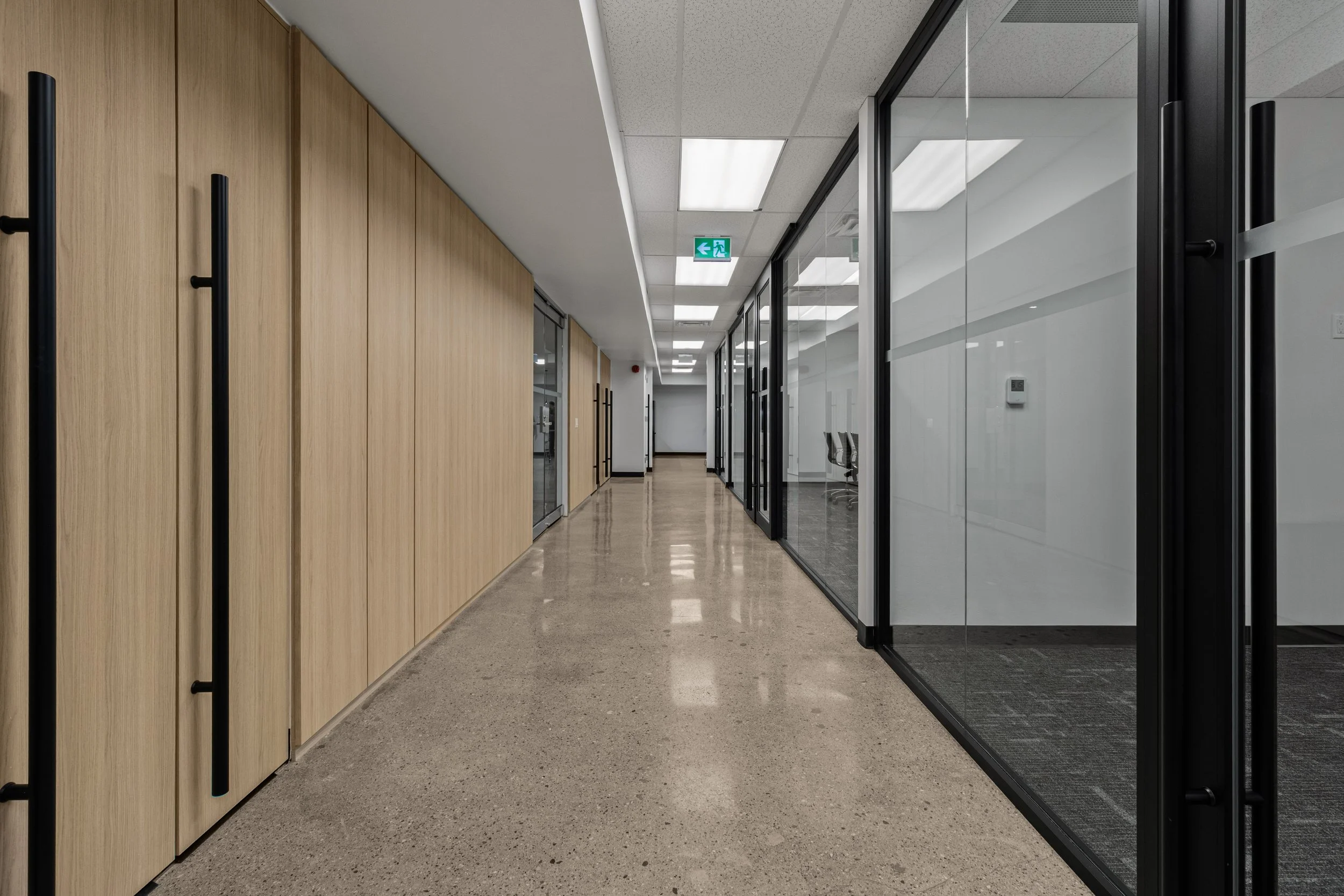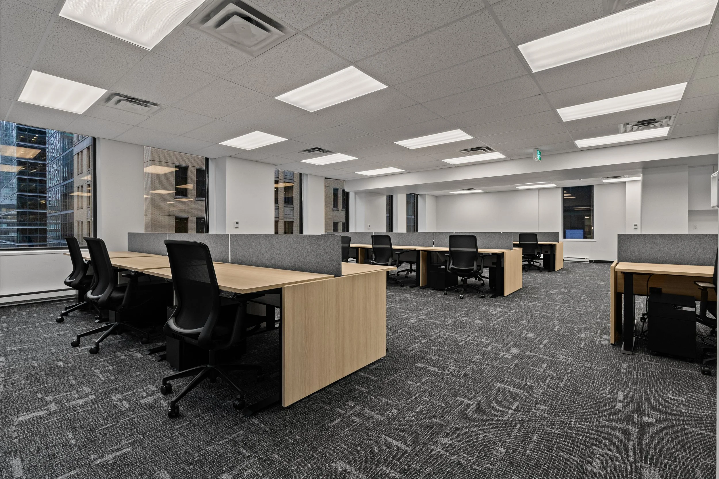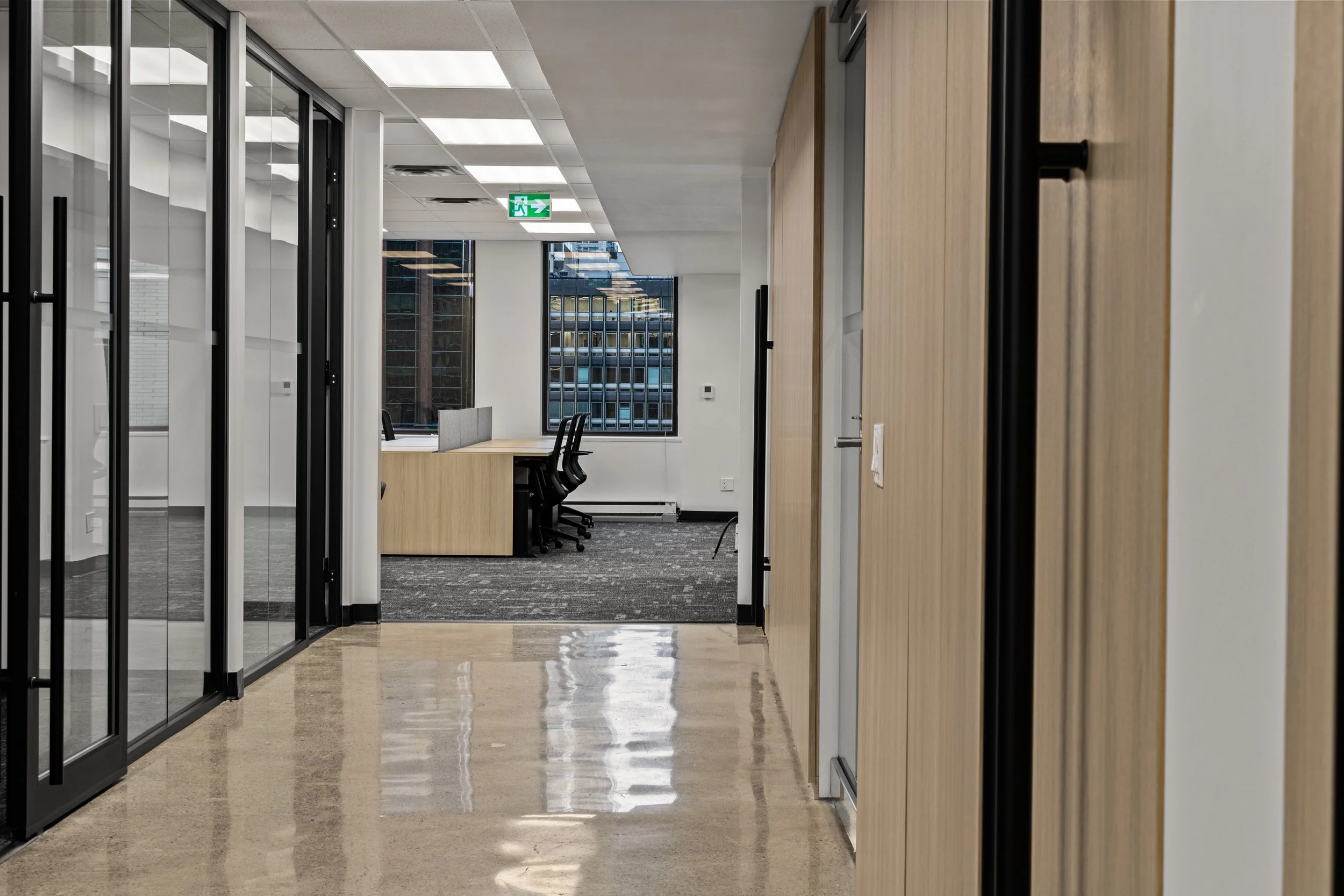 The design blends refined detailing and functionality, featuring glass-enclosed meeting rooms, integrated wall panelling, and high-end finishes that elevate tenant appeal and leasing potential. Despite tight downtown logistics and complex scheduling, Primary Construction delivered the turnkey build in just 10 weeks, coordinating closely with Dream’s team and KGRN Inc. to ensure seamless execution and quality craftsmanship.
